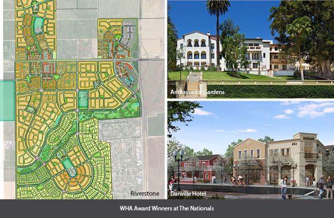 Later that evening was The Nationals, the awards put on by the National Association of Home Builders’ Sales and Marketing Council where WHA won three awards, including a Gold for Riverstone, an on-the-boards master-planned community in Central California, as well as Silver Awards for the Danville Hotel complex and for Ambassador Gardens in Pasadena. The gala was held at Caesar’s Palace in the grand ballroom.