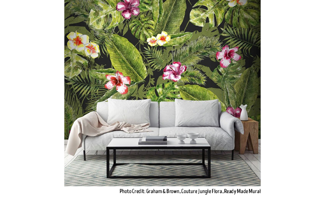High-tech, digital production methods, particularly for wallcoverings, have allowed for dramatic imagery, customization and lower price points. Floor-to-ceiling wallcovering murals are replacing living walls and artwork providing more impact with lower cost. These large-scale graphics featuring simple geometrics, vintage patterns, botanical motifs, wood grains, and animal prints and textures from Africa and India are roaring ahead, leaving cowhide and fur in their dust.