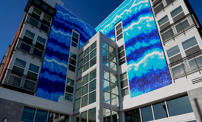 Recently completed in March of 2021, Las Ventanas is a 102-unit affordable housing, mixed-use podium building by AMCAL Multi-Housing, located in the heart of Downtown Long Beach. Designed by WHA’s Ron Nestor, Las Ventanas is a bright red building with a welcoming entryway landmarked by its 3 story glass tower at the corner of Long Beach Blvd. and PCH. Nearing the end of its completion, WHA’s Urban Studio was tasked with designing Las Ventanas’ tile art wall. Located above the front entry, the 1,000 square foot mural frames the glass tower and sits above the ground-level retail. Since the mural’s installation, Las Ventanas has become the focal point of the intersection.