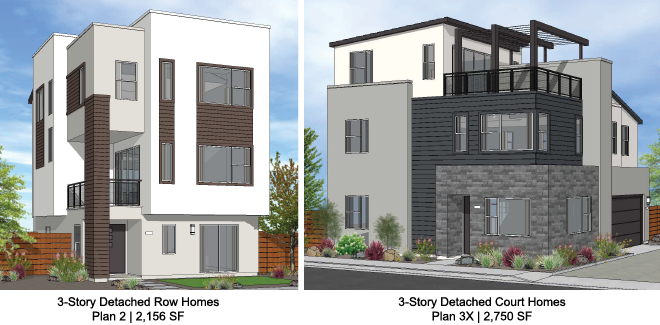 The 114 alley-loaded 3-story detached row homes are 30 feet wide and plotted at 17.5 du/ac. Three different plans range in size from 2000 – 2450 sq. ft., offering 3-4 bedrooms with 2-car standard garages. The exteriors feature a variety of material textures and colors, with a mix of pitched and flat roofs. Cantilevered upper levels and ‘pocket’ decks help vary the massing, and the use of parapet walls at select facades helps lend a contemporary flair.