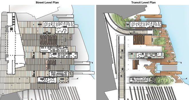 After months of work and plenty of feedback from my peers and professors, I developed a permanent steel structure that extended the city grid out to the waterfront. This armature would house various public programs—a farmers’ market, art gallery, coffee shop, and a large community plaza—while also remaining flexible for future additions or subtractions, as the city and the people using the spaces inevitably changed over time. These program elements would visually engage with the transportation options available, showcasing the systems people in transit were there to use: buses, subway, long-line trains, and ferries.