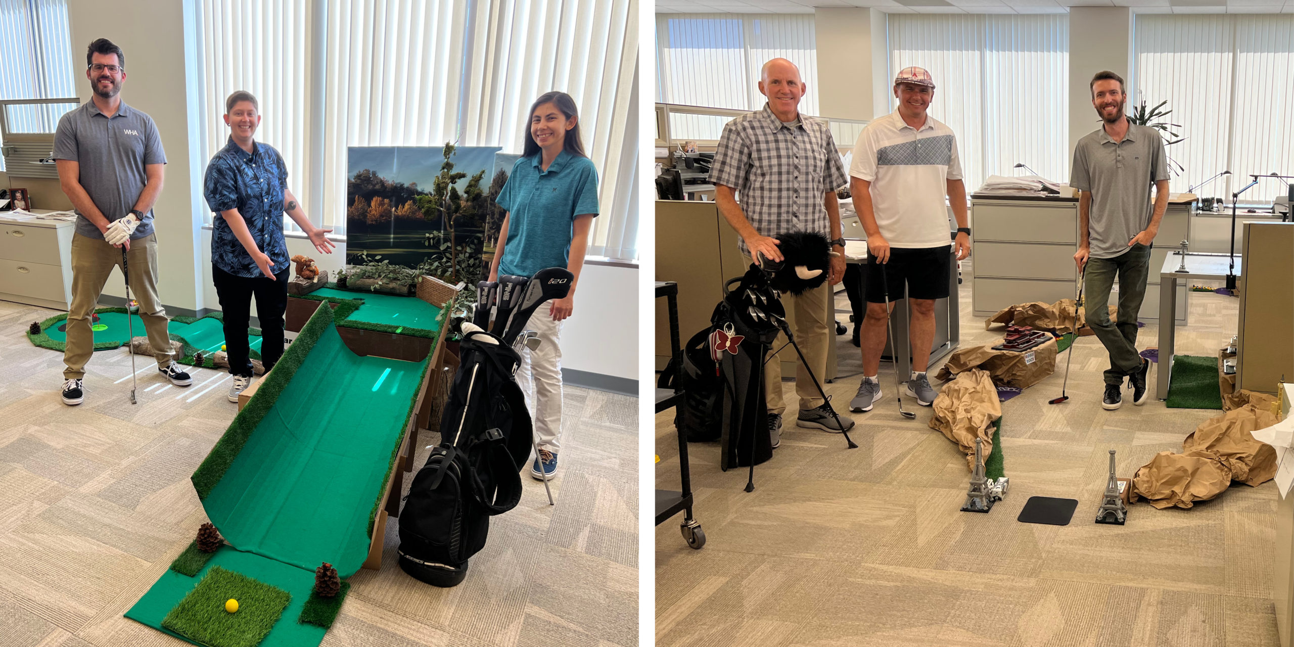Throughout the summer, the office has been participating in bi-weekly Summer Golf Nights where employees have had the opportunity to play 9 holes or to sharpen their golf skills at the driving range after a day’s work. Playing off this fun series, teams throughout the office were given a month to brainstorm and build the most tee-riffic golf course.