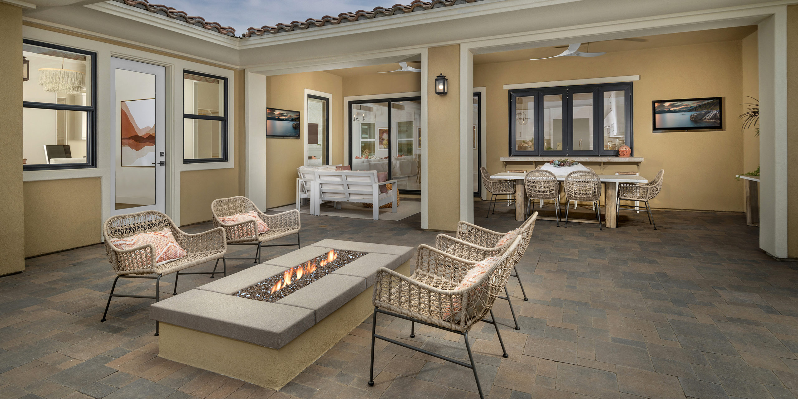 Covered patios open to extensive courtyards offering a serene setting to bask in the endless mountain views. The spaces are complete with a built-in kitchen and barbeque station, fire pit, dining, and lounge areas.