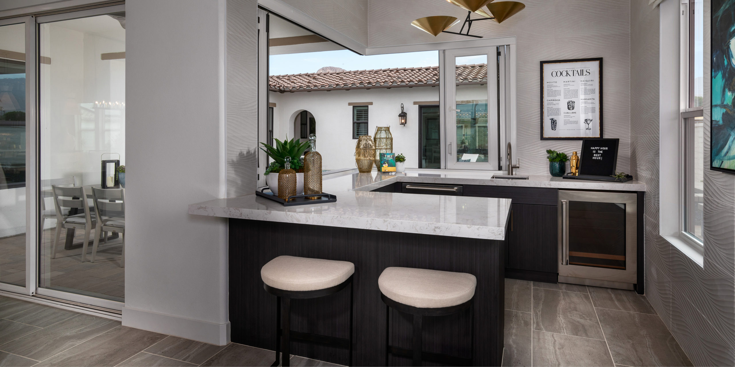 A unique detail catered to hosting guests is a wet bar fit with accordion windows connecting the indoor kitchen to the outdoor kitchen.