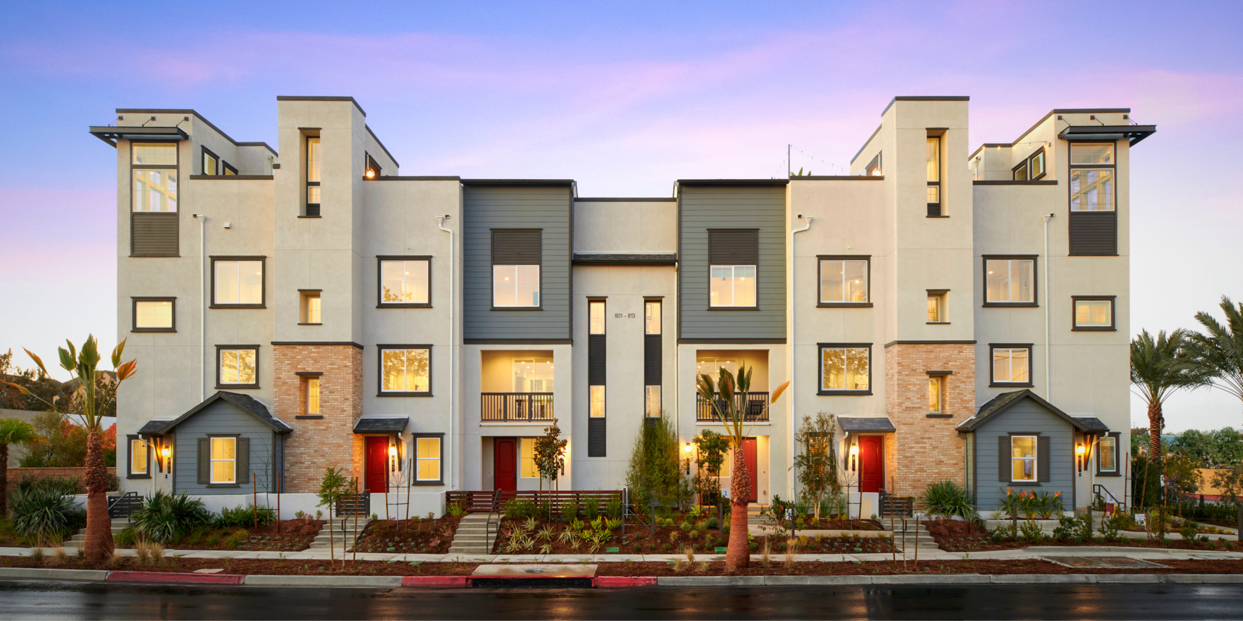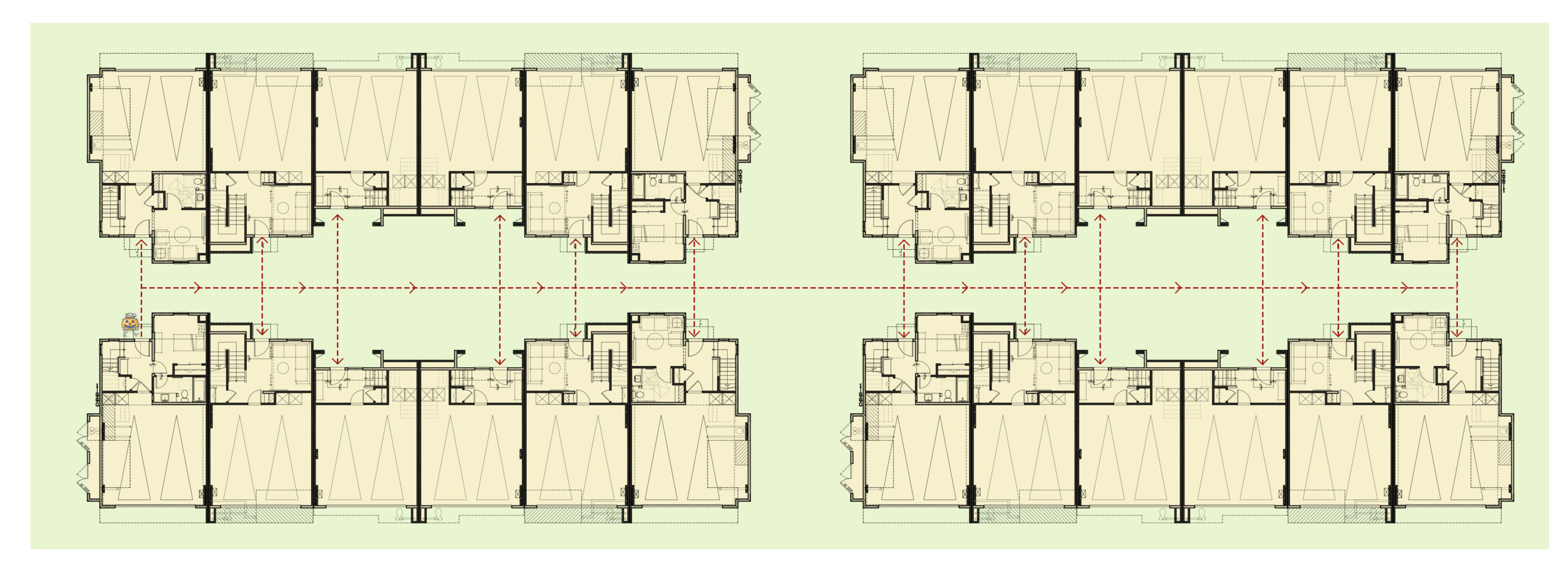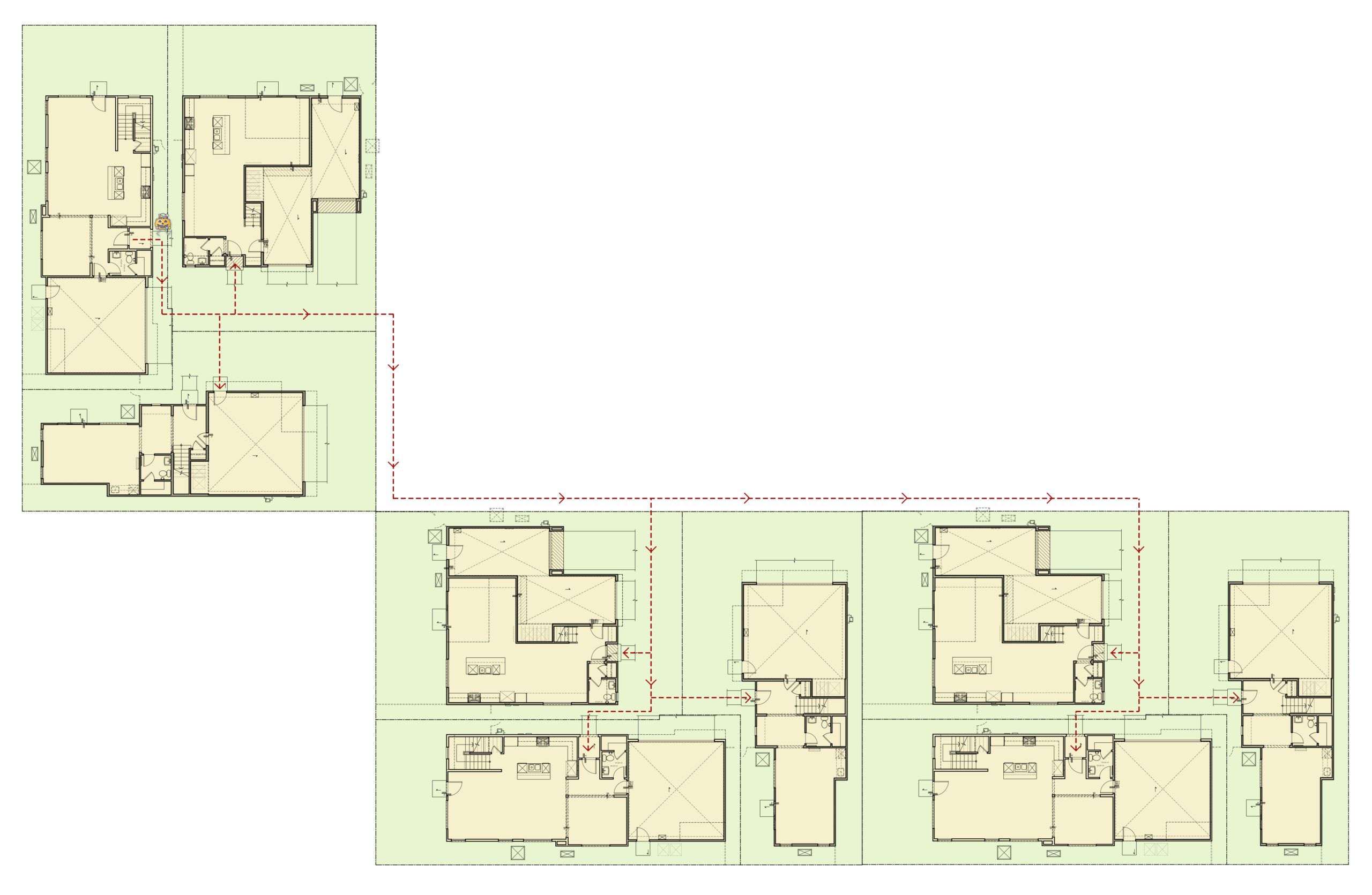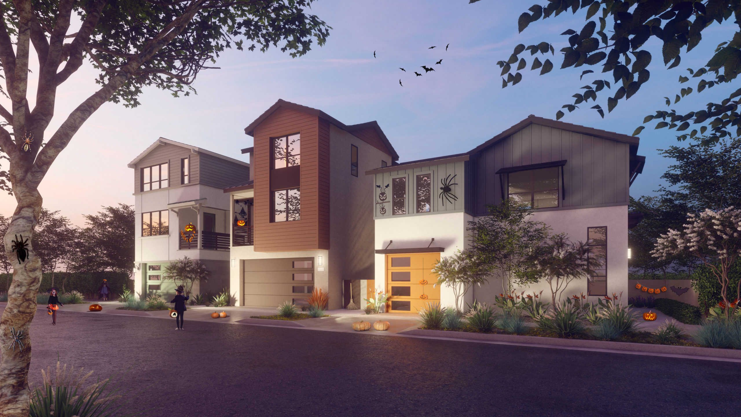 Now, let’s change the layout to a higher density one. A row townhouse community with buildings plotted so front doors are facing each other. Now the young trick-or-treater has the benefit of visiting more doors in less time, resulting in a greater candy yield. From a parent’s point of view, this layout greatly benefits supervision purposes. From your front door, you can watch your trick-or-treater visit each unit along your row as well as each unit across the way. In some cases, the added benefit of personally knowing those visited neighbors can greatly enhance the safety factor of an independent/un-supervised trick-or-treater. Some great examples of WHA row townhomes are Claret at Canvas, Saddleback Place, and Anza at Agrihood.