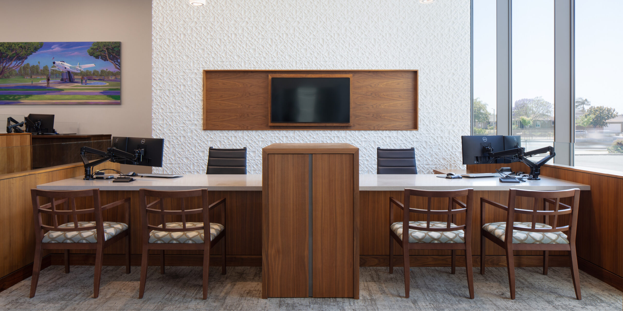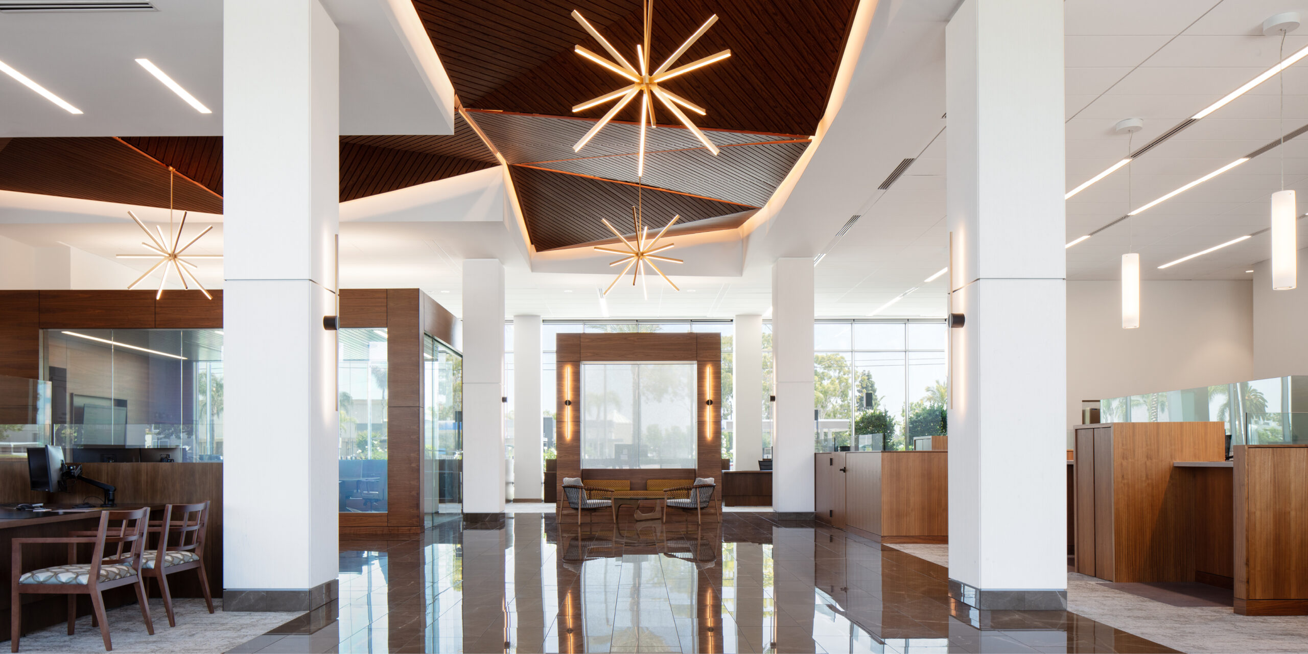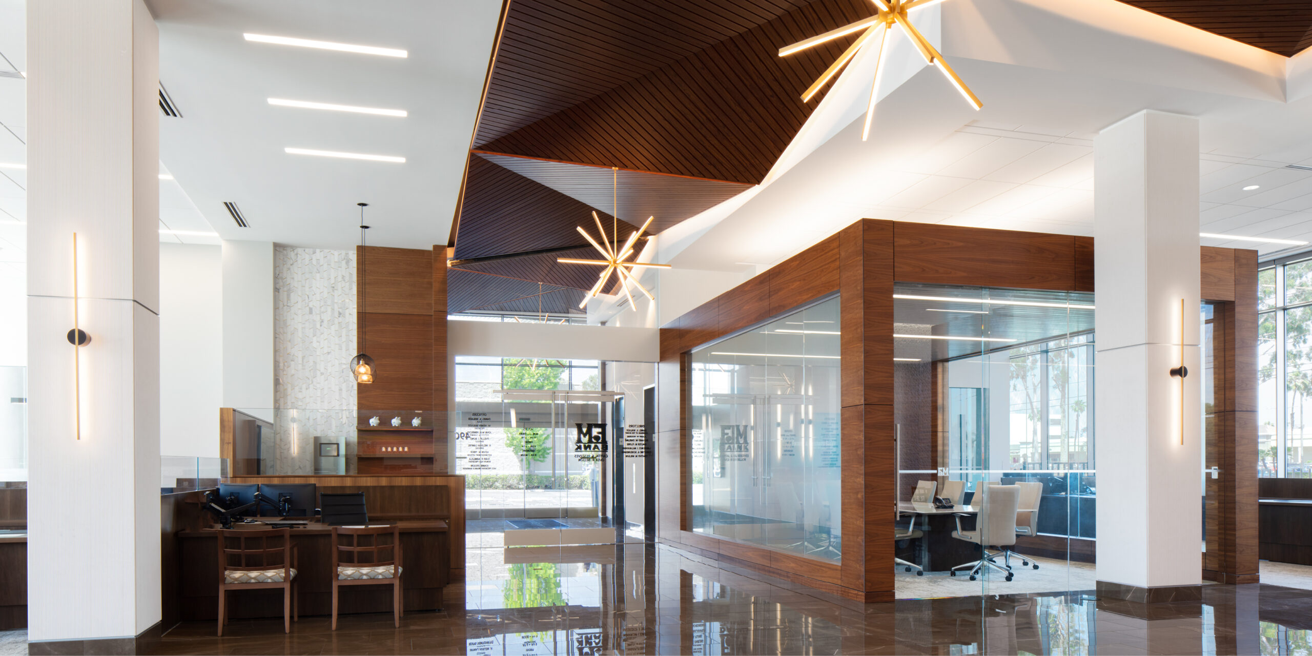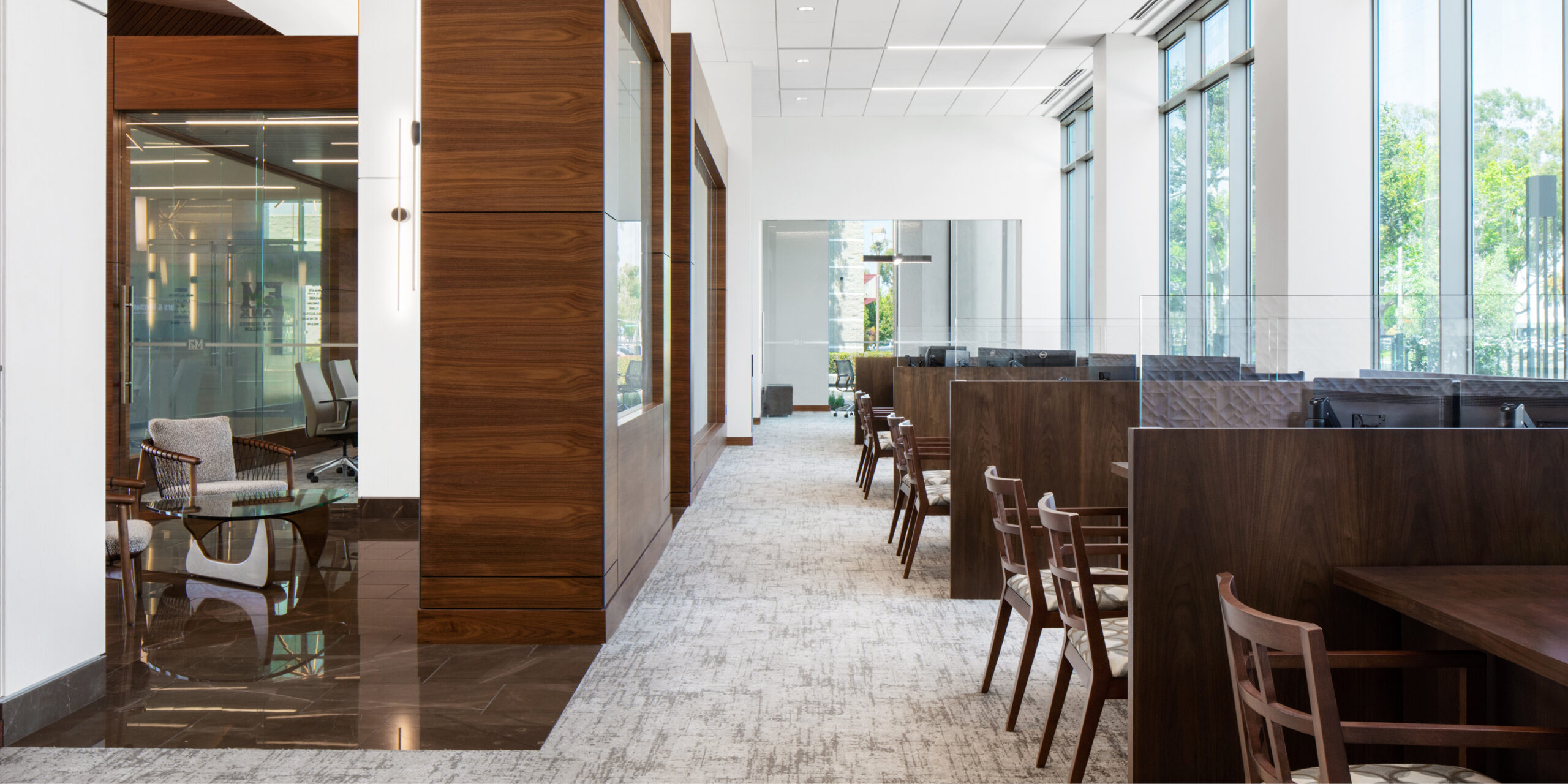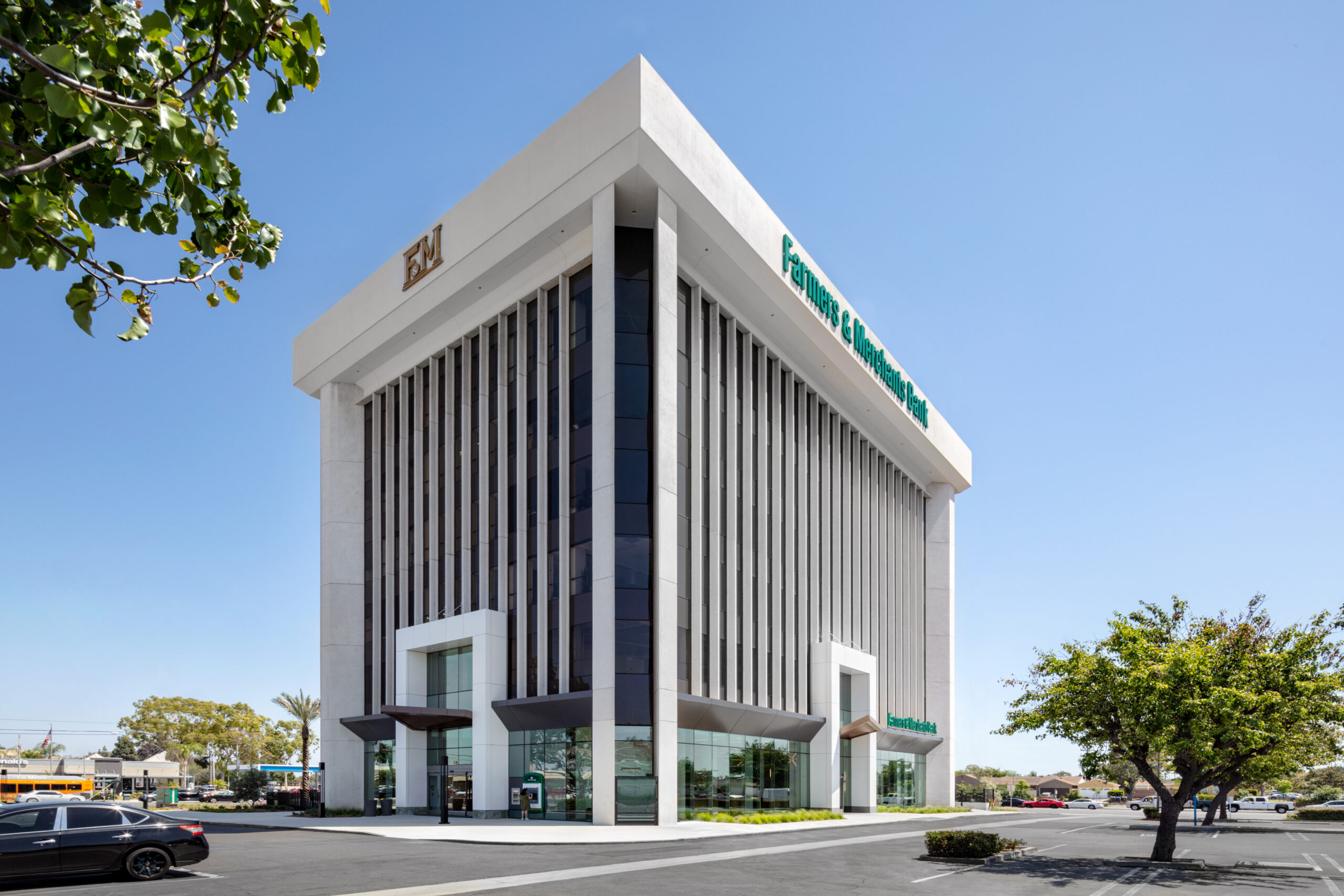 Farmers and Merchants Bank relocated their branch in Lakewood to a 6-story office building in 2020. The building is a focal point on Lakewood Boulevard as one of the tallest buildings in the city. To transform the space, our team retrofitted the existing building and created an attractive interior space with refined finishes. These improvements not only draw new and existing customers in for business but also provide employees with a contemporary office space to work in.
