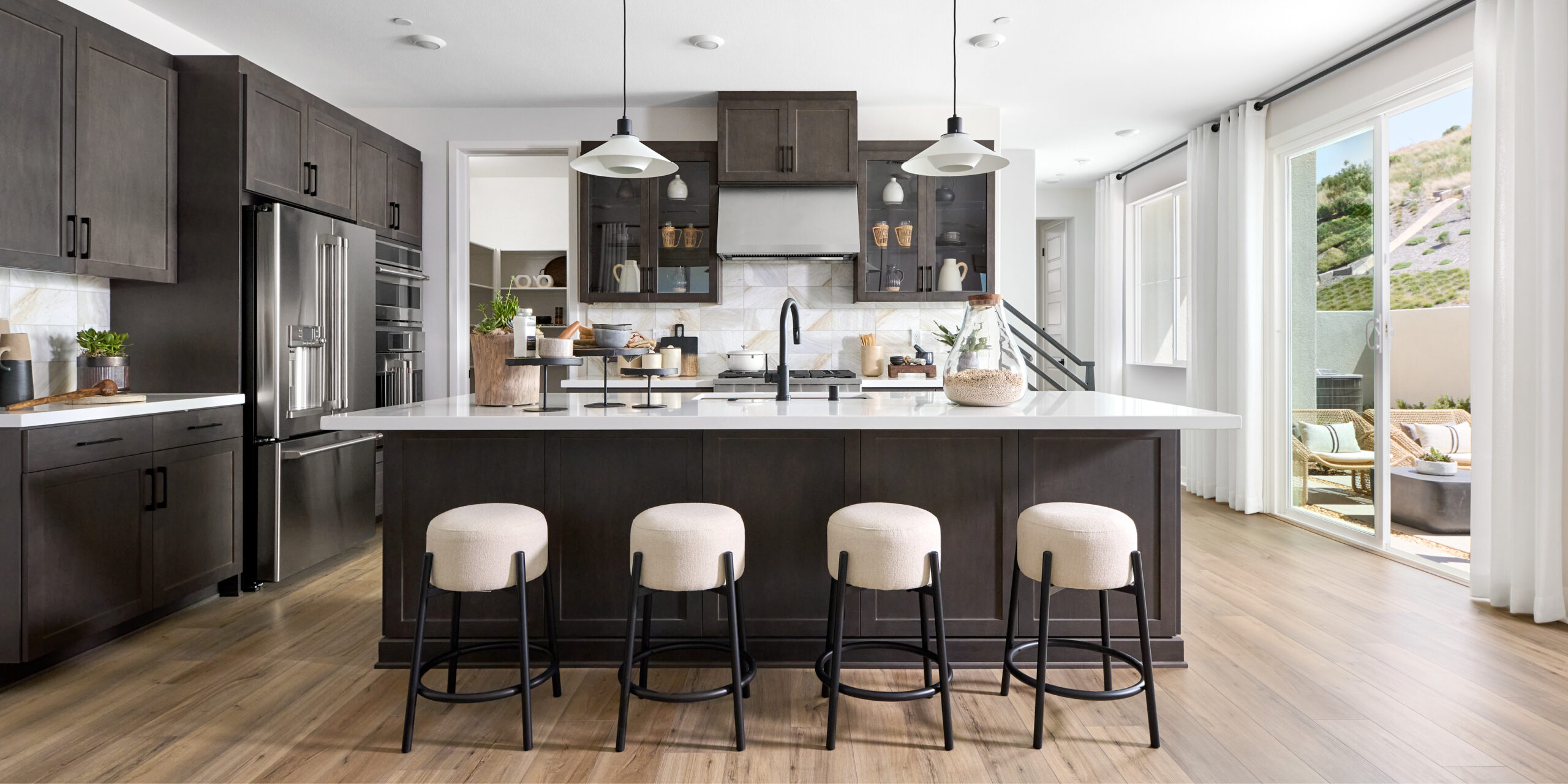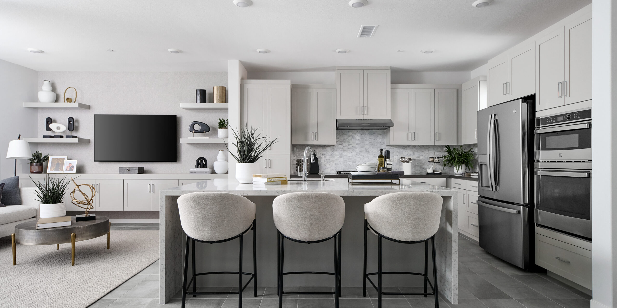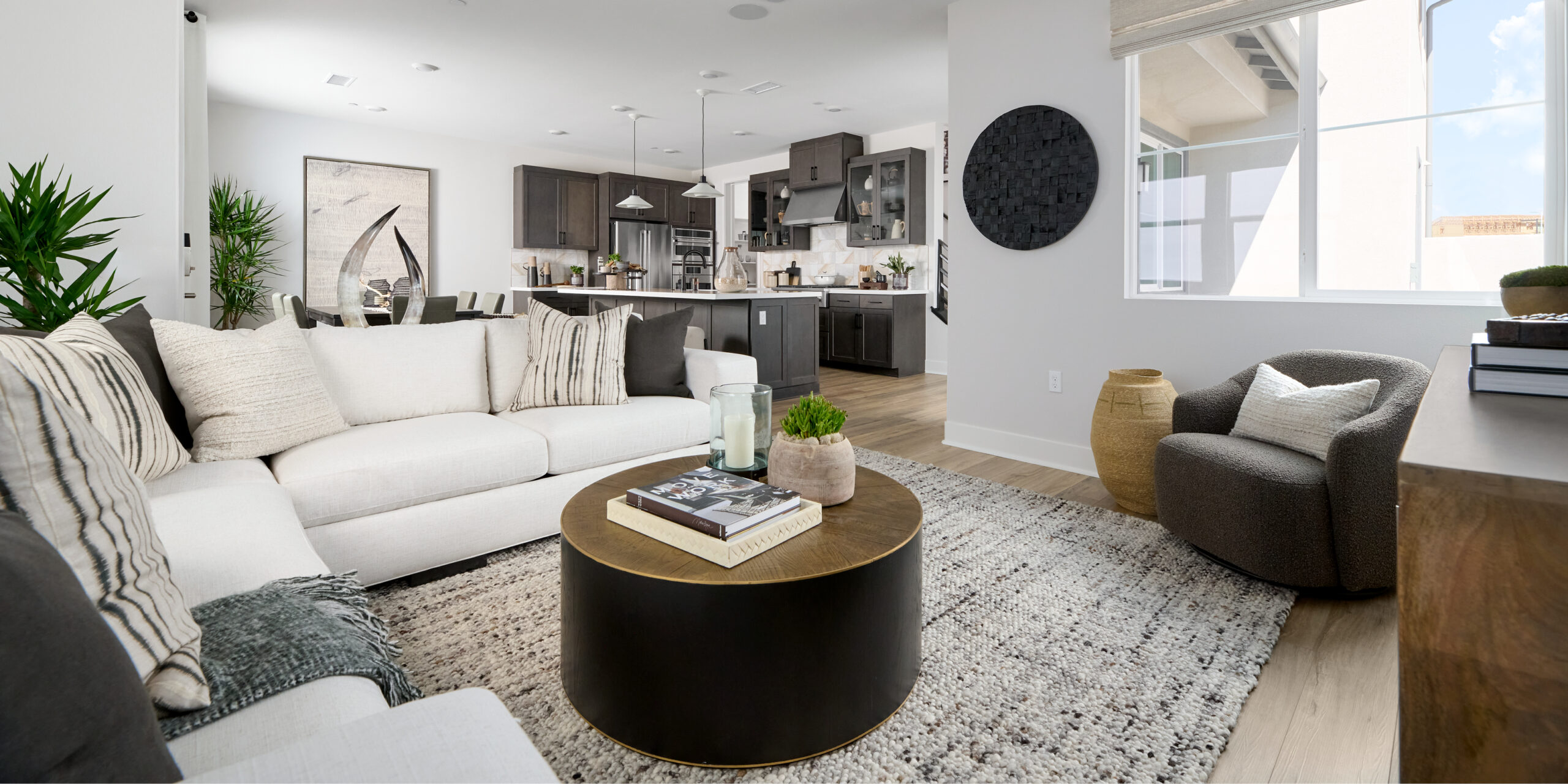 Four-sided architecture and single-story porch elements enhance the pedestrian experience, while generous building separations prevent the community from feeling overly dense. The homes also feature private pocket yards that elevate the indoor-outdoor living experience on the first floor. Thoughtfully varied plotting schemes that ensure every lot feels unique, whether it takes advantage of views, a paseo entry, or a wide street-facing elevation. Inside, Tri Pointe Homes partnered with interior designer Bobby Berk to deliver curated model home experiences that celebrate modern living with elevated design.