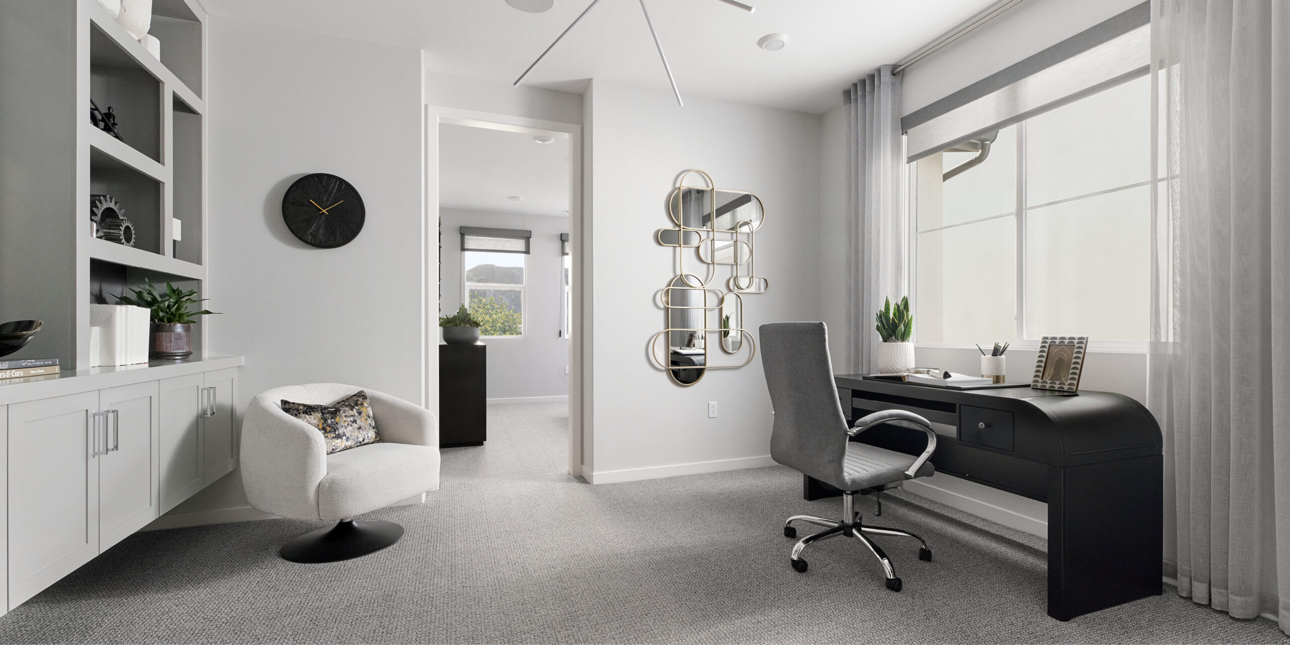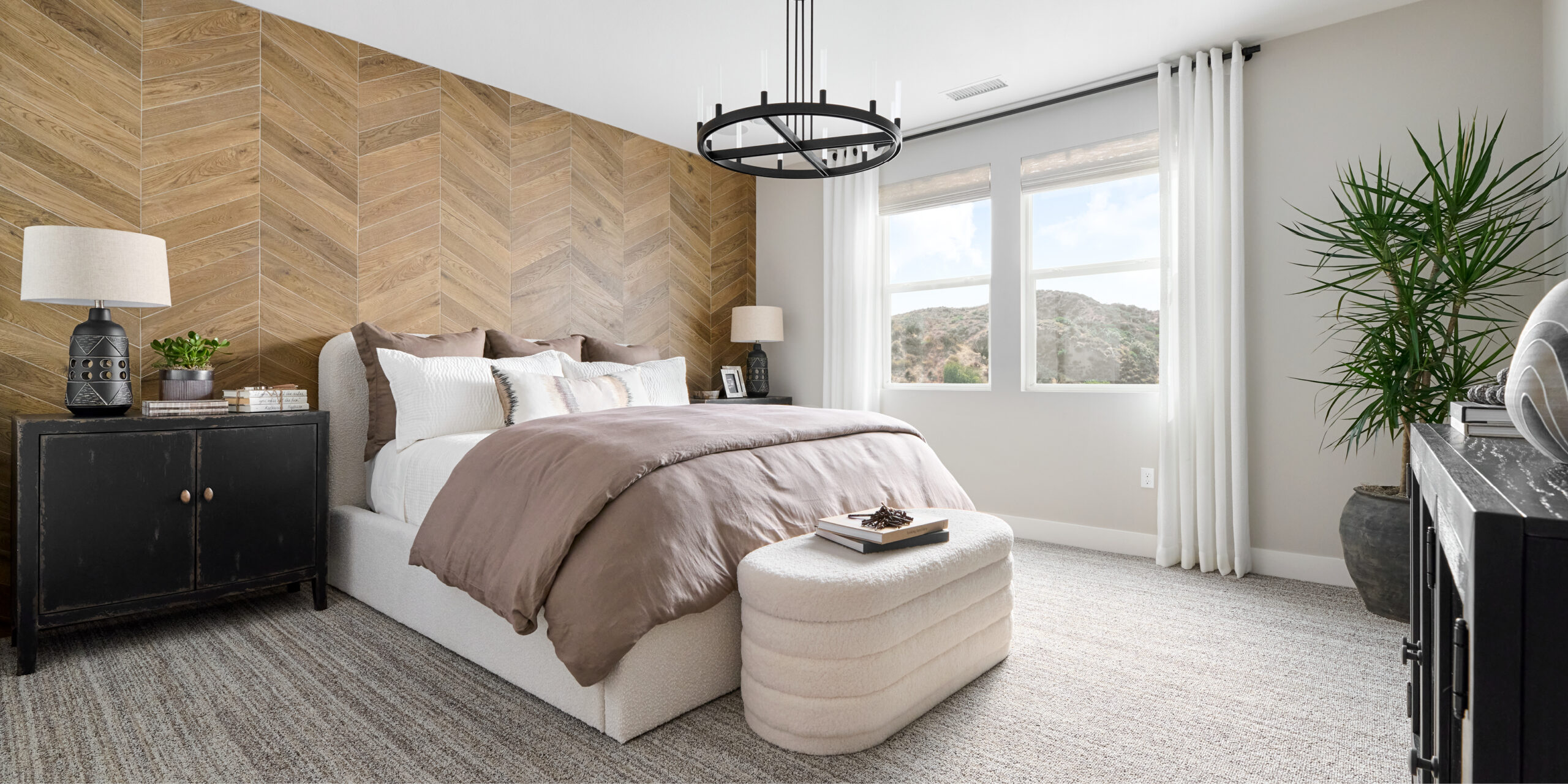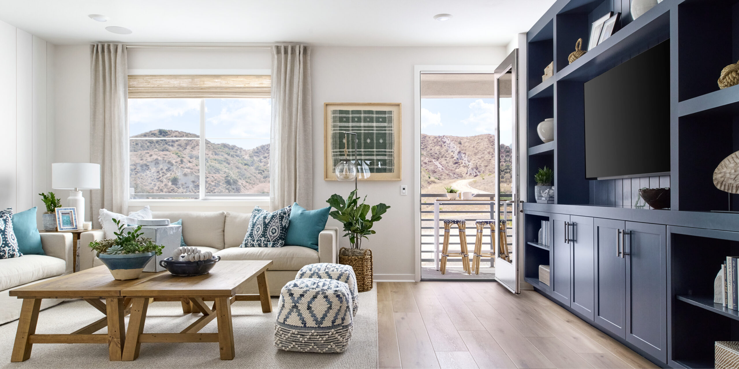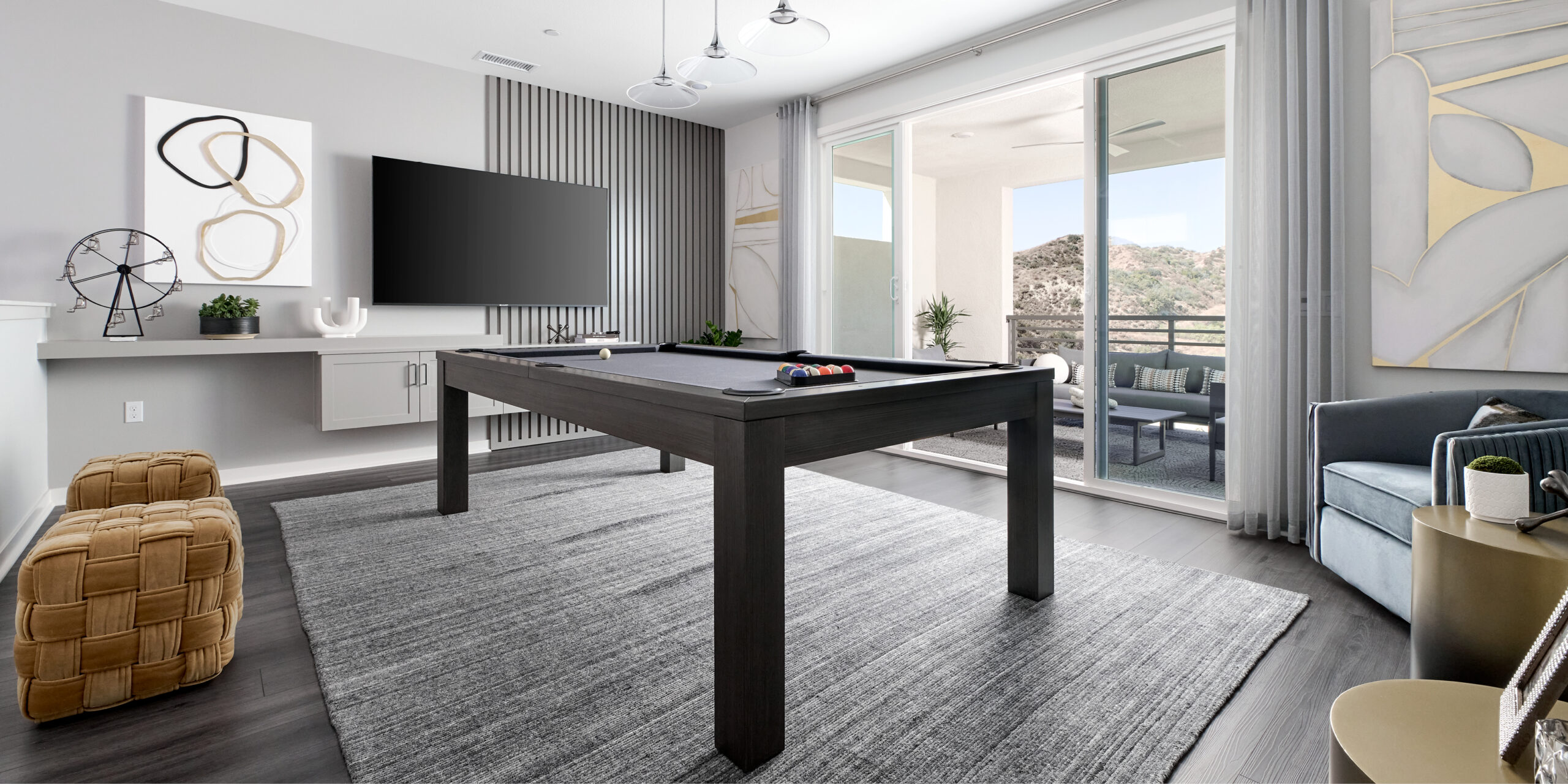 Four-sided architecture and single-story porch elements enhance the pedestrian experience, while generous building separations prevent the community from feeling overly dense. The homes also feature private pocket yards that elevate the indoor-outdoor living experience on the first floor. Thoughtfully varied plotting schemes that ensure every lot feels unique, whether it takes advantage of views, a paseo entry, or a wide street-facing elevation. Inside, Tri Pointe Homes partnered with interior designer Bobby Berk to deliver curated model home experiences that celebrate modern living with elevated design.