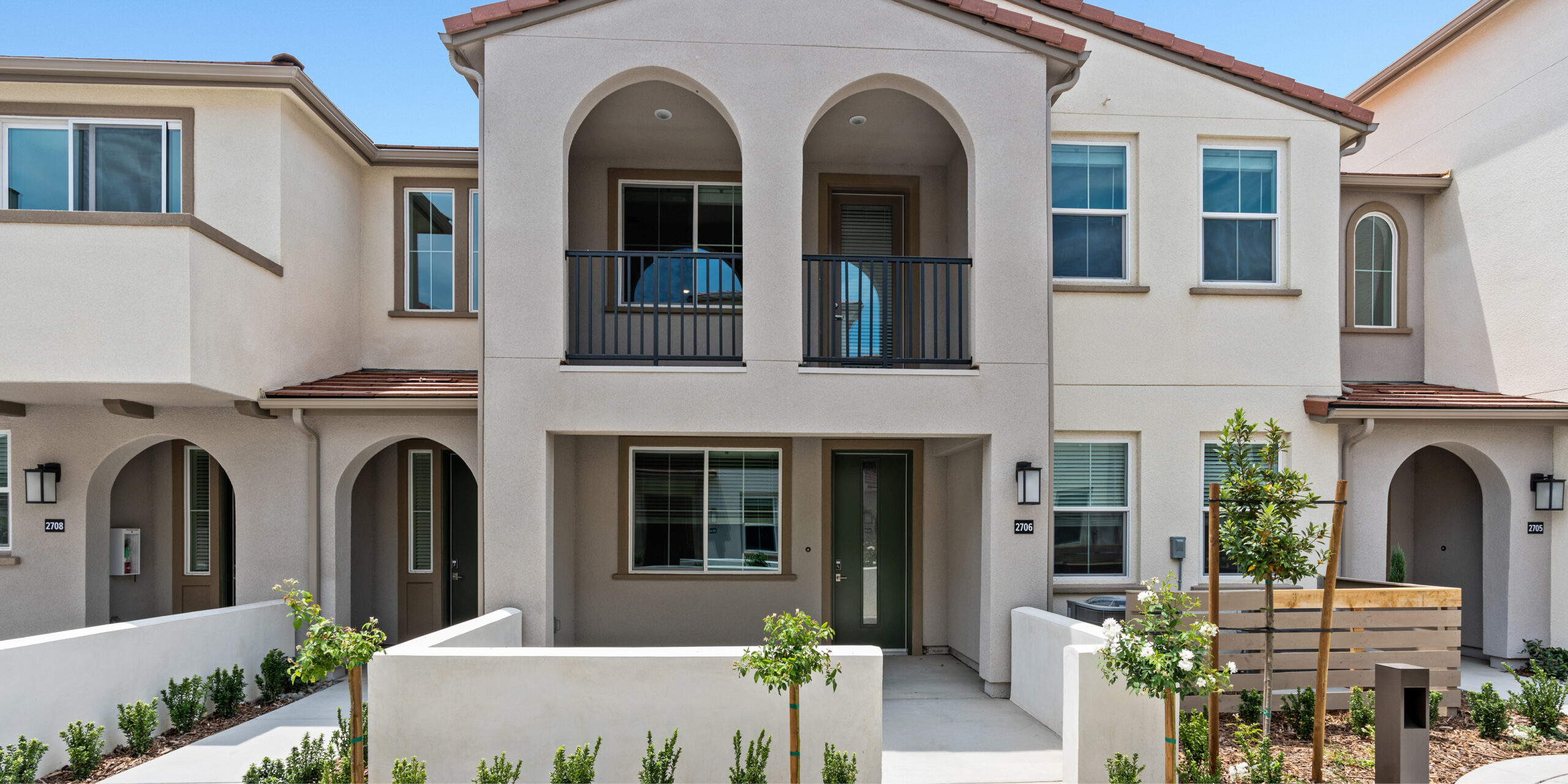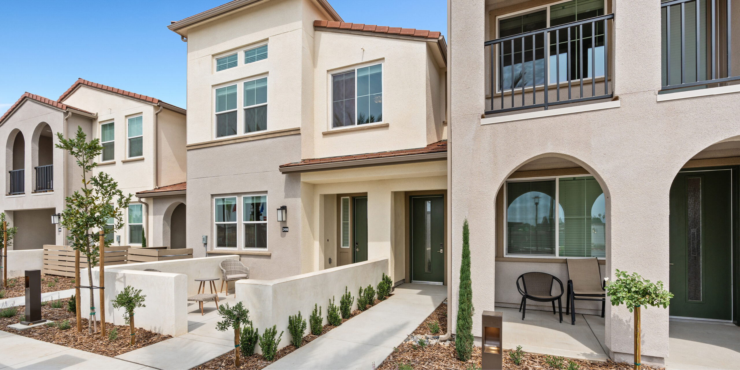 With an overall density of 23.8 units per acre and floorplans ranging from 378 to 1,649 square feet, Portola Plaza was crafted to serve all buyer demographics while enriching the surrounding residential fabric. The community features two distinct residential product types: two-story apartments tailored for families, and three-story townhomes design for elevated living. Ground-floor urban flats cater to studio seekers and car-free lifestyles. The townhomes feature direct garage access, tech areas, and decks oriented towards Loma Vista Park. The park-facing units were intentionally designed to feel like penthouses, maximizing views and creating a sense of retreat.