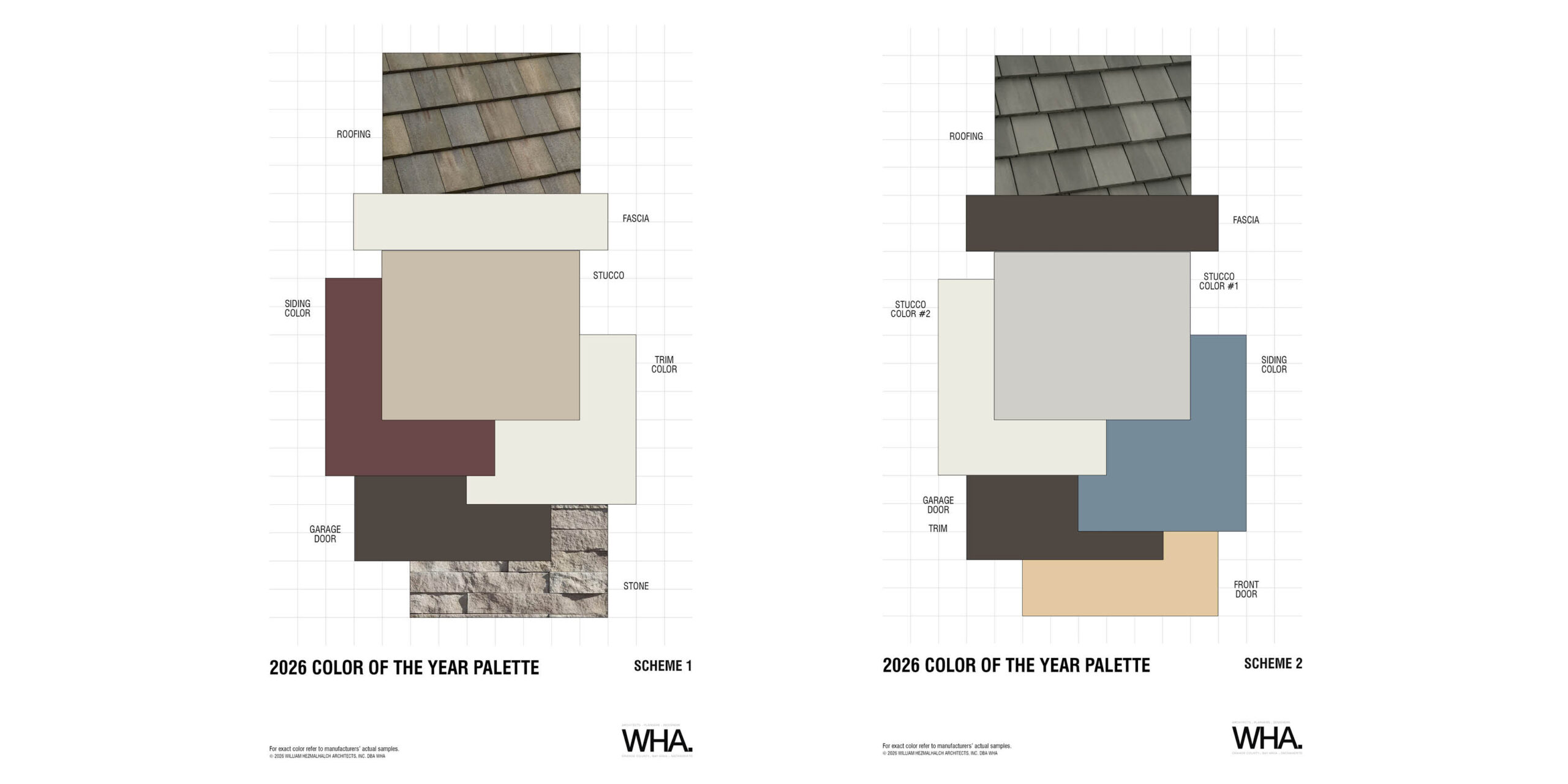 Our 2026 architecture prototype brings our palette to life. Revival leads the story with red siding, and the supporting hues provide balance – softening transitions, highlighting massing, and enriching each material. Together, the colors show how a well‑crafted palette can strengthen identity and bring warmth and cohesion to a diverse set of elevations.